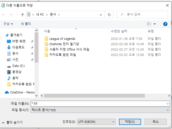 3. IDE가 없다면 메모장에서 파일을 연 후 다른이름으로 저장한 다음 아래 인코딩 정보를 UTF-8(BOM) 이 아닌 UTF-8로 새로 저장해준다.